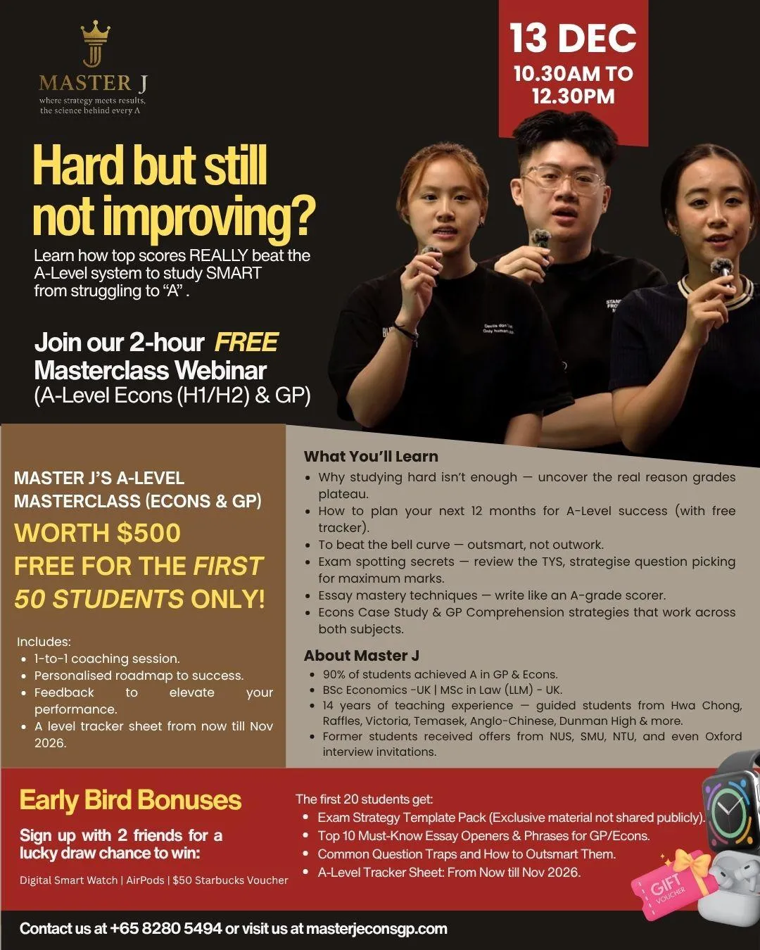 At Master J, we don’t just teach , we transform. Our proven framework combines exam strategy, academic mastery, and personal mentorship to unlock every student’s potential. Whether you’re taking A-Level Economics (H1/H2) or General Paper, we help you uncover blind spots, sharpen analytical thinking, and perform with confidence to score.